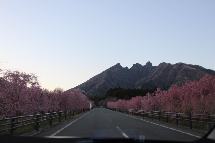夕暮れの阿蘇根子岳としだれ桜